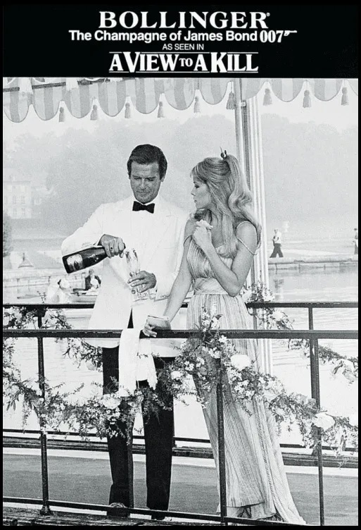 2025 also marks the 40th anniversary of the James Bond film A View To A Kill, adding another chapter to the shared history of the two iconic names. Champagne Bollinger makes a signature appearance in the movie. The Champagne Bollinger flows at the party at Zorin's French estate as part of the high-society atmosphere and James Bond and Stacey Sutton enjoy a bottle of Champagne Bollinger, as seen in a movie poster.